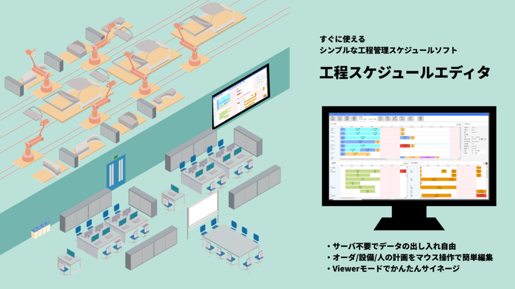 2月 10, 2026 / 最終更新日時 : 2月 10, 2026 webadmin お知らせ すぐに使えるシンプルな管理ソフト「工程スケジュールエディタ」の特設ページを開設いたしました! 連動する3つのガントチャートで、気軽に使える工程スケジュールソフトです。 Excelに限界を感じている、スケジューラの導入を検討したが断念した、生産計画の変更が多くスケジュール表をメンテナンスしきれない…といった方におすすめの製品です。 特設ページでは、実際の操作感が分かるデモ動画や、機能の詳細を紹介しています。 画像をクリックの上、是非ご覧ください。